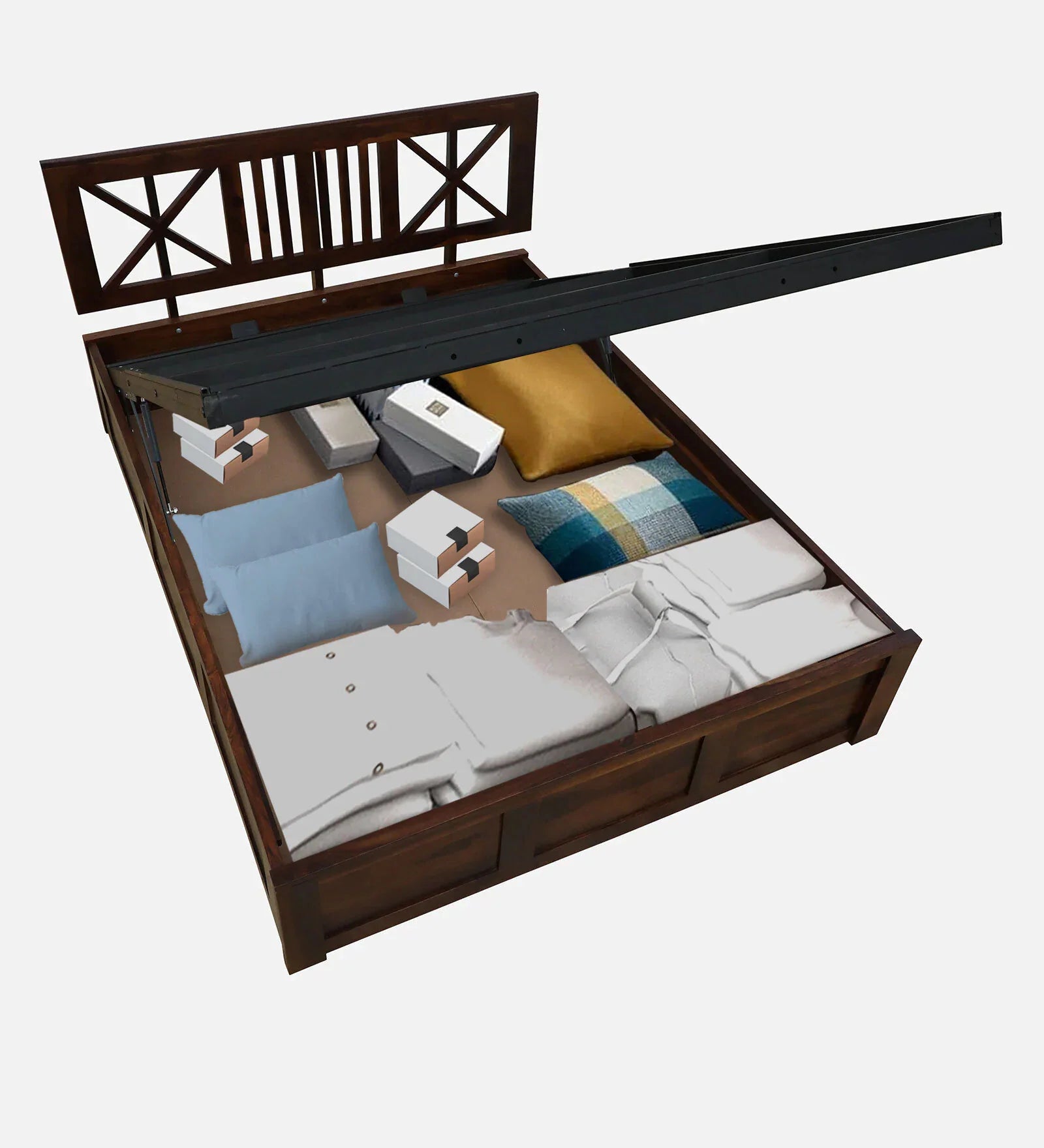 Sheesham Wood Queen Size Bed In Provincial Teak Finish With Headboard & Hydraulic Storage